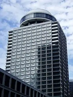 During its construction in 1971, the structure was briefly the tallest building in Ottawa until the neighbouring Place de Ville Tower C surpassed it during its construction. The hotel opened in 1972 as a Holiday Inn.[3] It was later owned by Radisson Hotels before being taken over by Marriott Hotels & Resorts. In 2010, the building underwent significant renovations to the main floor. The top floor restaurant, Merlot Rooftop Grill (originally called La Ronde) closed and re-opened as Summit, a private event space.[4][5] Summit remains the only revolving room in Ottawa, rotating at a rate of approximately one revolution per two hours. The main floor renovations included closing Cafe Toulouse, their street-level restaurant and re-opening as "spin" Kitchen & Bar.[6]