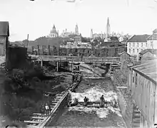 In 1843, Philip Thompson and Daniel McLachlin harnessed the Chaudière Falls for use with grist and sawmills.[19] In 1852, the Chaudière saw A.H. Baldwin, John Rudolphus Booth, Henry Franklin Bronson and Weston, J.J. Harris, Pattee and Perley, John Rochester, Levi Young.[19] All were former Americans who had immigrated except for Rochester.[10] J.?. Turgeon operated a sawmill in the canal basin (another no longer existing area of the canal used for turning watercraft, just south of the bridge by the entrance).[10]
