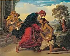 Later, he assisted Fay in painting the Elberfeld Town Hall; which is now the Von der Heydt Museum. He and Fay also collaborated on the designs for the restoration of the windows at the Basilica of St. Cunibert.[2] In 1848, he went to Düsseldorf, to hold an exhibition, and settled there permanently. There, he focused on religious scenes and altarpieces, inspired by the aesthetics of the Nazarene movement.
