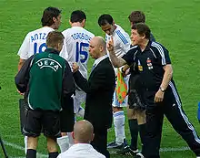 In August 2001, following Vassilis Daniil's departure, Rehhagel was appointed as the new manager of the Greece national team,[2] ahead of other candidates, such as Marco Tardelli, Nevio Scala, Vanderlei Luxemburgo, and Terry Venables, who were also being considered for the managerial post.[3] Rehhagel's first match in charge was in October 2001, a 2002 World Cup qualifier against Finland, which ended in a 5–1 away defeat.[3][4] As a result, he rebuilt the squad, and in October 2003, after a 1–0 win over Northern Ireland,[5] Greece qualified automatically for Euro 2004, ahead of Spain and Ukraine. Ranked 150–1 outsiders,[6] they nevertheless defeated host nation Portugal,[7] holders France and the much more fancied Czech Republic on the way to the final, where they again defeated Portugal 1–0. Rehhagel, who was seen as the man most responsible for the team's success, became the first foreign manager ever to win a European Championship and remains the only one to date. Despite not having a star-studded line-up, the Greek team won the championship, conceding no goals in the knockout stage.