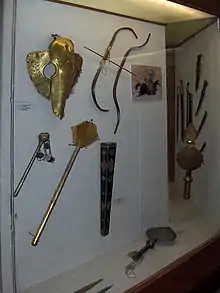The shaft of arrows was made of pine and the head of iron, brass, or bone. At the end of the arrow are feathers (telek) to stabilise flight and knotted nock (gez) to hold the arrow firmly against the bowstring.