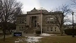The library building is a fine example of the Neo-Classical style.[3] The two-story building rests on a raised basement and is topped by a shallow Roman style dome. It features a symmetrical façade and a projecting portico. The exterior walls are covered in grey Bedford stone that is cut into smooth ashlar blocks. Larger blocks, or quoins, are featured on the corners of the building. The original main doors were replaced c. 1950, but the original iron scrollwork remains in the transom area.[4]