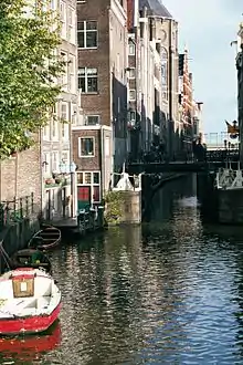 The Kolksluis (Kolk Sluice) has been operating since the Middle Ages.[2] The Kolksluis, the lock, was in a vault of the Oudezijds Kolk. That was demolished in 1702 and replaced by the present bridge.[3] During high tide, the lock is closed to protect flooding. The river Amstel continues to flow into the canals to the south, raising their level. When the tide drops, the lock is opened and the waters flow out to the sea. Through this spuien (sluicing) process the canal waters are kept fresh.[2]