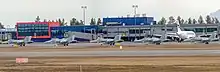 Oulu Airport (IATA: OUL, ICAO: EFOU; Finnish: Oulun lentoasema, Swedish: Uleåborgs flygplats) is located in Oulu, Finland, 5.7 NM (10.6 km; 6.6 mi) south-west[2] of the city centre. The airport is the second busiest in Finland after Helsinki-Vantaa Airport, as measured by the number of passengers (ca. 1.1 million in 2018). There are around 10 daily flights to Helsinki. Oulu Airport is also extensively used by the Finnish Air Force for training purposes and the managing body of the airport is Finavia. Oulu Airport has offered free wireless network access for passengers since May 2007.[4]