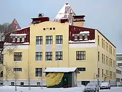 The school building of the Oulun Suomalainen Yhteiskoulu was built in 1907-1908 in Art Nouveau style influenced by national romanticism. The four-storey stone building was designed by architect Victor Sucksdorff. The building has been extended in 1955 with an extension that was adapted to the original building and in 1960 with a modern extension.[7] The last major restoration work was completed in the autumn of 2006.