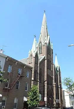 Our Lady of Częstochowa-St Casimir Parish is a church in New York City at 24th Street in Brooklyn. The church, which was designated for Polish immigrants, was founded in 1896. It could also be spelled Częnstochowa, due to the tail on the third letter. The original church building was a wood-frame structure, which was destroyed by a fire in 1904. The replacement was a Gothic Revival Style with a tower and steeple rising to 175 feet that was built on the site of the original church.[1]