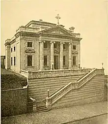 The parish was founded by Dona Manuela de Laverrerie de Barril, the wife of the Spanish Consul-General in New York.[3][5] Archer Milton Huntington, the railroad heir and founder of the Hispanic Society of America, was recruited to the cause and funded the project for the second Spanish-speaking Catholic church in New York. The church building was begun in 1909 to designs by Archer's cousin, Charles P. Huntington.[2] The building was enlarged and extended in 1924 by Lawrence G. White, son of Stanford White,[3] including an addition on 156th Street. Previously, the entrance to the church, which sat on a hill, was by way of an outdoor brick stairway with terra cotta balustrades, but White's addition allowed for an entrance at the street level, with the climb to the church occurring via an indoor staircase.[4]
