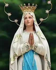 Soubirous described the apparition as dressed in a flowing white robe, with a blue sash around her waist. This was the uniform of a religious group called the Children of Mary, which, on account of her poverty, Soubirous was not permitted to join (although she was admitted after the apparitions).[15] Her aunt Bernarde was a long-time member.