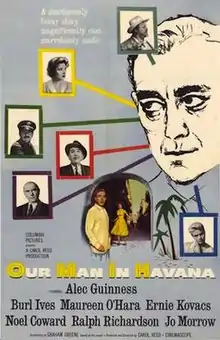 Our Man in Havana is a 1959 British spy comedy film shot in CinemaScope, directed and produced by Carol Reed, and starring Alec Guinness, Burl Ives, Maureen O'Hara, Ralph Richardson, Noël Coward and Ernie Kovacs.[2][3][4] The film is adapted from the 1958 novel Our Man in Havana by Graham Greene. The film takes the action of the novel and gives it a more comedic touch. The movie marks Reed's third collaboration with Greene.[5]