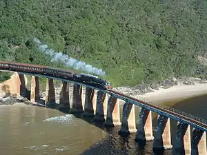 The Outeniqua Choo Tjoe was the last remaining continually-operated passenger steam train in Africa, ending operation in August, 2006. The line on which it operated links the towns of George and Knysna in the Western Cape, South Africa, and was completed in 1928. The scenic 67-kilometre (42 mi) route from George took 3 hours, following the rugged coastline of the Garden Route,and passing through Victoria Bay, Wilderness, Goukamma, and Sedgefield before crossing a bridge over the Knysna Lagoon and ending at the Knysna station.