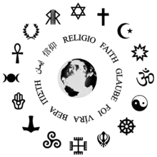 Religious symbols in clock-wise order: Judaism, Christianity, Islam, Baháʼí Faith, Hinduism, Taoism, Buddhism, Sikhism, Slavic neopaganism, Celtic polytheism, Heathenism (German paganism), Semitic neopaganism, Wicca, Kemetism (Egyptian paganism), Hellenism, Italo-Roman neopaganism.