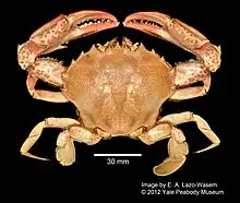 Ovalipes ocellatus, known as the lady crab, is a species of crab from eastern North America.[1] Other names for it include the leopard crab or Atlantic leopard crab due to the leopard-like rosette patterns on its shell, the calico crab (not to be confused with Hepatus epheliticus), or ocellated crab.[3] It has a shell 3 in (7.6 cm) long and only slightly wider, which is covered in clusters of purple spots. It occurs from Canada to Georgia, and lives mainly on molluscs, such as the Atlantic surf clam.