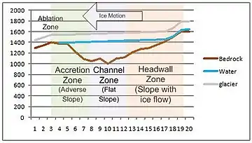 The upglacier side of an overdeepening is referred to as the headwall, while the downglacier side is referred to as an adverse slope. Water flowing down the headwall gains energy, which melts the surrounding ice, creating channels. As the water passes through the bottom, it continues to drop in temperature; since it is highly pressurized at this point, the melting temperature is suppressed and the water becomes supercooled as it melts surrounding ice. The flowing water transports sediment and locally erodes the bedrock.[10]
