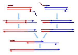Following annealing of the primer to the template, DNA replication proceeds to the end of the template. The duplex is denatured and the second primer anneals to the newly formed DNA strand, containing sequence from the first primer. Replication proceeds to produce a strand of the required sequence, containing the mutation.