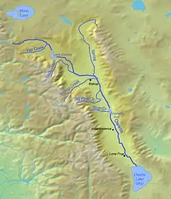 ![]() The Owens River course begins (top left) as Deadman Creek, and the river designation begins where the Big Springs tributary enters the Deadman Creek channel.[1]: 89, 108, 113 | |