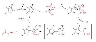 A key feature of the cofactor TPP is the relatively acidic proton bound to the carbon atom between the nitrogen and sulfur in the thiazole ring, which has a pKa near 10.[11] This carbon center ionizes to form a carbanion, which adds to the carbonyl group of oxalyl-CoA. This addition is followed by the decarboxylation of oxalyl-CoA, and then the oxidation and removal of formyl-CoA to regenerate the carbanion form of TPP. While the reaction mechanism is shared with other TPP-dependent enzymes, the residues found in the active site of OXC are unique, which has raised questions about whether TDP must be deprotonated by a basic amino acid at a second site away from the carbanion-forming site to activate the cofactor.[12]