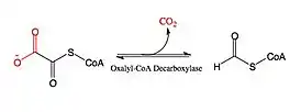 OXC belongs to the family of lyases, specifically the carboxy-lyases (decarboxylases), which cleave carbon-carbon bonds. The systematic name of this enzyme class is oxalyl-CoA carboxy-lyase (formyl-CoA-forming). Other names in common use include oxalyl coenzyme A decarboxylase, and oxalyl-CoA carboxy-lyase. This enzyme participates in glyoxylate and dicarboxylate metabolism. It employs one cofactor, thiamin diphosphate (TPP), and plays a key role in catabolism of oxalate, a highly toxic compound that is a product of the oxidation of carbohydrates in many bacteria and plants.[1] Oxalyl-CoA decarboxylase is extremely important for the elimination of ingested oxalates found in human foodstuffs like coffee, tea, and chocolate,[2] and the ingestion of such foods in the absence of Oxalobacter formigenes in the gut can result in kidney disease or even death as a result of oxalate poisoning.[3]