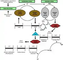 In response to an increased flux of hydrogen peroxide and other organic peroxides such as tert-butyl hydroperoxide and cumene hydroperoxide, peroxide stimulon gets activated. Studies of E. coli response to H2O2 have shown that exposure to H2O2 elevated mRNA levels of 140 genes, of which 30 genes are members of the OxyR regulon. The genes include many genes coding for metabolic enzymes and antioxidant enzymes demonstrating the role of these enzymes in reorganization of metabolism under stress conditions.[1]