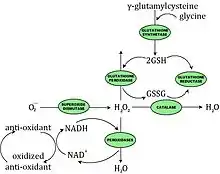The enzymatic components may directly scavenge active oxygen species or may act by producing the nonenzymatic antioxidants. There are four enzymes that provide the bulk of protection against deleterious reactions involving active oxygen in bacteria: SODs (superoxide dismutases encoded by sodA and sodB), catalases (katE and katG), glutathione synthetase (gshAB) and glutathione reductase (gor). Some bacteria have NADH-dependent peroxidases specific for H2O2.