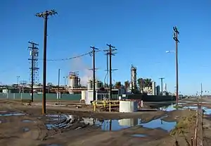 The Oxnard Oil Field is a large and currently productive oil field in and adjacent to the city of Oxnard, in Ventura County, California in the United States. Its conventional oil reserves are close to exhaustion, with only an estimated one percent of the original oil recoverable with current technology remaining: 434,000 barrels (69,000 m3) out of an original 43.5 million. However, the reservoir includes an enormous deposit of tar sands, ultra-heavy oil classed as an unconventional petroleum reserve, and potentially containing 400 million barrels (64,000,000 m3) of oil equivalent, should it become economically feasible to extract.[1] Present operators on the field include Tri-Valley Oil & Gas Co., Anterra Energy Services, Inc., Chase Production Co., and Occidental Petroleum through its Vintage Production subsidiary.[2] As of the beginning of 2009, there were 34 active wells on the field.[2]