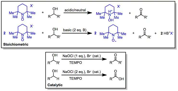 Nitroxide-catalyzed oxidations involve N-oxoammonium intermediates as the active oxidizing agent. The mechanism of oxidation of the nitroxide radical depends on the terminal oxidant employed. Two-electron oxidants, such as NaOCl, are able to directly convert nitroxides into oxoammoniums.