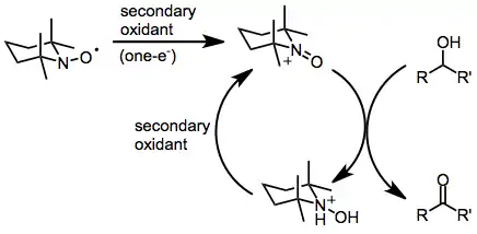 Oxoammonium-catalyzed oxidation reactions involve the conversion of organic substrates to more highly oxidized materials through the action of an N-oxoammonium species. Nitroxides may also be used in catalytic amounts in the presence of a stoichiometric amount of a terminal oxidant.[1] Nitroxide radical species used are either 2,2,6,6-tetramethylpiperidine-1-oxyl (TEMPO) or derivatives thereof.