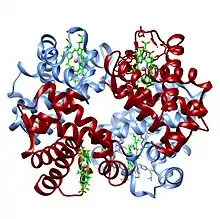 Hemoglobin (Hb) is the primary vehicle for transporting oxygen in the blood. Each hemoglobin molecule has the capacity to carry four oxygen molecules. These molecules of oxygen bind to the iron of the heme prosthetic group.[1]