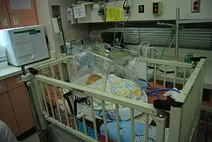 Typically the tent is made of transparent plastic material. It can envelop the patient's bed with the end sections held in place by a mattress to ensure that the tent is airtight. The enclosure often has a side opening with a zipper.