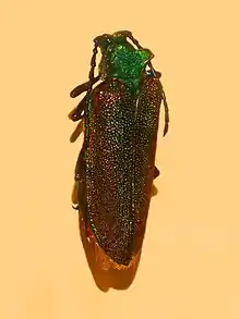 The body is massive and characterised by metallic colour, bluish or green on the head and prothorax, and red on the elytra. Their antennae and legs have a blue metallic colour.