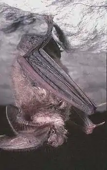 The Ozark big-eared bat is an endangered species found only in a small number of caves in Arkansas, Oklahoma and Missouri, the southern central United States. Also known as the western big-eared bat, the long-eared bat, and the lump-nosed bat, its appearance is defined by a pair of outsize ears and a lump-adorned nose. The Ozark big-eared bat is the largest and reddest of the five subspecies of Corynorhinus townsendii and is medium-sized and weighs from 0.2 to 0.5 ounces.[1] It has very large, 1-inch-long ears that connect at the base across the forehead.[1] The snout has large, prominent lumps above the nostrils.[1] These particular bats feed on moths and other insects; they forage along forest edges.[1]