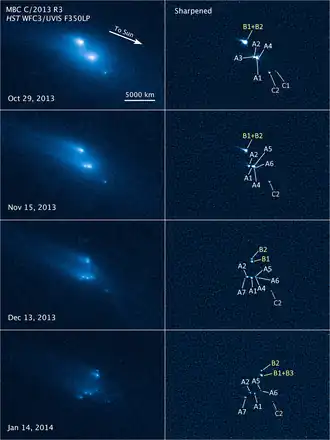 Observations by Hubble on 29 October 2013 showed that component B was initially a single object possessing its own dusty coma and tail. On 15 November 2013, component B began to split into two fragments, B1 and B2, that eventually moved far enough apart to be resolved by Hubble on 13 December 2013.[5]: 12 The fainter fragment, B2, separated from B1 at a relative speed of 0.32 m/s and faded steadily with constant absolute magnitude.[5]: 3, 9, 12 On the other hand, the brighter fragment B1 had its absolute magnitude brighten by more than a magnitude between 13 December 2013 and 14 January 2014, before ejecting another small fragment, B3, that was seen by Hubble on 13 February 2014. This sudden brightening of B1 may be associated with the beginning of B3's separation, based on similar behavior seen in comets before fragmenting.[5]: 12