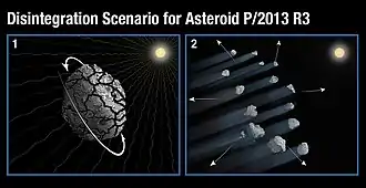 The activity of P/2013 R3 was caused by the catastrophic rotational breakup of its rapidly-rotating nucleus, which progressively disintegrated into slow-moving fragments and dusty debris over several months.[5]: 1 From the combined cross-sectional areas of P/2013 R3's fragments, the asteroid's precursor nucleus originally had a diameter of 800 m (2,600 ft) before it broke up.[5]: 9 It is the first asteroid discovered while in the process of disintegrating.[5]: 1