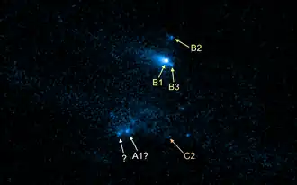 A faint fragment, named component C,[lower-alpha 1] was first seen southwest of component A in Keck Telescope observations on 1 and 2 October 2013.[3]: 2 It was detected again in Gran Telescopio Canarias observations on 11 and 12 October 2013 and 6.5-m Magellan Telescope observations on 28 and 29 October 2013.[15][5]: 4 Component C was 5–10% as bright as component A and it was separated 2.4 arcseconds apart (projected distance of 2,500 km or 1,600 mi) at the time of the Gran Telescopio Canarias observations.[15]