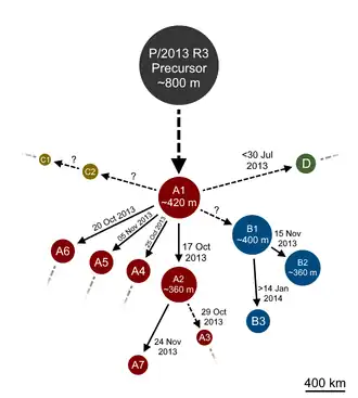 When P/2013 R3 was discovered, it had already fragmented into two distinct co-moving components,[1] named P/2013 R3-A and P/2013 R3-B.[7]: 8 High-resolution observations by the 10-m Keck Telescope at Mauna Kea Observatory and the 10.4-m Gran Telescopio Canarias at La Palma Observatory in October 2013 revealed two more new fragments, named C and D, that had presumably split off from the main component A.[15][3]: 1 Even higher-resolution observations by the Hubble Space Telescope starting in October 2013 revealed that component A was composed of many more smaller fragments, with component C having already split and component B later ejecting small fragments. Hubble observations continued until February 2014, when P/2013 R3 became unobservable as it entered conjunction with the Sun.[5]: 13
