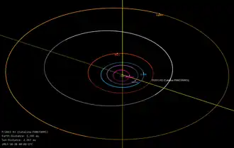 P/2013 R3 and its fragments orbit in the outer main asteroid belt at a semi-major axis of 3.03 AU from the Sun, completing one revolution every 5.28 years.[7]: 5 It has a low orbital inclination of 0.90° with respect to the ecliptic and a modest orbital eccentricity of 0.273, which makes it come as close as 2.20 AU from the Sun at perihelion to as far as 3.86 AU from the Sun at aphelion.[2][5]: 15 It last passed perihelion on 5 August 2013.[3]: 1 The orbit of P/2013 R3 is very close to being in a 9:4 mean-motion resonance with Jupiter, which makes it subject to the planet's gravitational perturbations that can alter its orbit over millions of years.[7]: 8