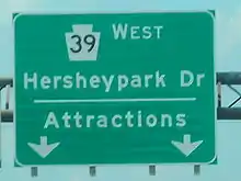 Pennsylvania Route 39 (PA 39) is a 17.83-mile-long (28.69 km) state highway located in Dauphin County, Pennsylvania, United States. PA 39 runs from North Front Street near Harrisburg east to U.S. Route 322 (US 322) and US 422 near Hummelstown and Hershey. The route passes through the northern and eastern suburbs of Harrisburg and passes by Hersheypark, Giant Center, as well as the primary production factory for The Hershey Company. Between Harrisburg and Manada Hill, it is known as Linglestown Road, from Manada Hill to Hershey as Hershey Road and from Hershey to near Hummelstown and Hershey as Hersheypark Drive. Prior to the establishment of PA 39 in 1937, PA 39, had previously been designated as a route in northeastern Pennsylvania during the 1920s. That designation was deleted when it was renumbered US 11. As a result, PA 39 is one of a few routes which has a set of child routes which are no where near the primary route.