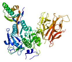Proprotein convertase subtilisin/kexin type 9 (PCSK9) is an enzyme encoded by the PCSK9 gene in humans on chromosome 1.[5] It is the 9th member of the proprotein convertase family of proteins that activate other proteins.[6] Similar genes (orthologs) are found across many species. As with many proteins, PCSK9 is inactive when first synthesized, because a section of peptide chains blocks their activity; proprotein convertases remove that section to activate the enzyme.[7] The PCSK9 gene also contains one of 27 loci associated with increased risk of coronary artery disease.[8]