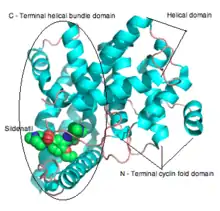 PDE enzymes are composed of 3 functional domains: an N-terminal cyclin fold domain, a linker helical domain and a C-terminal helical bundle domain (see figure 3).[9] The active site is a deep pocket at the junction of the 3 subdomains and is lined with highly conserved residues between isotypes of PDE.[14] The pocket is approximately 15 Å deep and the opening is approximately 20 by 10 Å. The volume of the active site has been calculated to be between 875 and 927 Å3.[14] The active site of PDE5 has been described as subdivided into 3 main regions based on its crystal structure in complex with sildenafil:[7]
