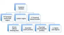 The PDE5 enzyme has a molecular mass of 200 kDa and its active state is a homodimer.[21] PDE5 consists of monomers and each contains two major functional domains: the regulatory domain (R domain) which is located in the N-terminal portion of the protein and the catalytic domain (C domain) located in the more C-terminal portion of the protein.[33][21]