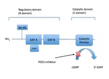 Phosphorylation of a single serine by PKG1 and the allosteric cGMP binding site activates the PDE5 catalytic activity and the result is a negative feedback regulation of cGMP/NO/PKG1 signalling. cGMP therefore interacts with both allosteric and catalytic domain of the PDE5 enzyme and PDE5 inhibitors compete with cGMP for binding at the catalytic domain resulting in higher cGMP levels.[33] PDE5 domains are demonstrated in figure 2.