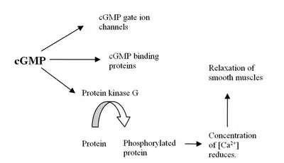 Penile erection is a hemodynamic event in the smooth muscle of corpus cavernous.[26] PDE5 is the main cGMP hydrolysing enzyme found in penile corpus cavernous.[27] Erection is triggered by release of the neurotransmitter nitric oxide (NO) from non-adrenergic and non-cholinergic neurons from nerve ending in the penis as well as from endothelial cells. NO activates soluble guanylyl cyclase in smooth muscle cells in the penis which results in increased production of 3'-5'-cyclic guanosine monophosphate from guanosine-5'-triphosphate (GTP).[21][28][29] Cyclic GMP binds to the cGMP-dependent protein kinase (PKG1) which phosphorylates several proteins that results in decreased intracellular calcium. Lower intracellular calcium leads to smooth muscle relaxation and ultimately penile erection. This pathway is demonstrated in figure 1.[29][30]