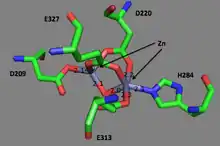 Asp209, Asp220, Glu313, Glu327, and His284 make up the active site of prolidase from Pyrococcus furiosus (1PV9). The zinc ions are bridged by the carboxylate groups of aspartate and glutamine residues. Bond lengths between the zinc ions and carboxylate groups of the amino acids are also indicated.