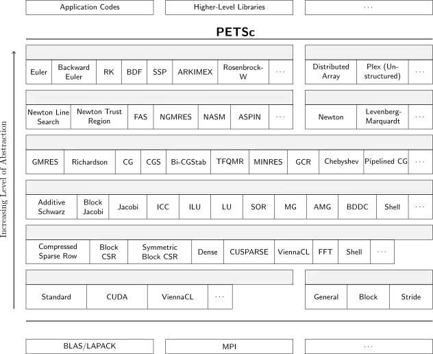 The Portable, Extensible Toolkit for Scientific Computation (PETSc, pronounced PET-see; the S is silent), is a suite of data structures and routines developed by Argonne National Laboratory for the scalable (parallel) solution of scientific applications modeled by partial differential equations. It employs the Message Passing Interface (MPI) standard for all message-passing communication. PETSc is the world’s most widely used parallel numerical software library for partial differential equations and sparse matrix computations. PETSc received an R&D 100 Award in 2009.[1][2][3] The PETSc Core Development Group won the SIAM/ACM Prize in Computational Science and Engineering for 2015.[4]