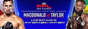 This will mark the second PFL playoff card, along with being the first PFL event held outside of America. The event will mark the start of the Heavyweight and Welterweight playoffs, with UFC veteran and former Bellator champion Rory MacDonald scheduled to take on undefeated Magomed Umalatov. On the other side of the bracket, Sadibou Sy takes on Carlos Leal.[4] The Heavyweight bracket was to see Denis Goltsov taking on 2021 PFL Champion Bruno Cappelozza, while Ante Delija faced Renan Ferreira.[3] However after picking up an injury, Cappelozza was unable to continue in the tournament and replaced by Matheus Scheffel.[5] After visa issues forced Umalatov and Goltsov to pull out of their respective bouts due to visa issues, they were replaced bu Dilano Taylor and Juan Adams respectively.[6]