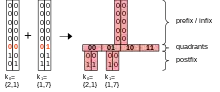 This works trivially for lookup, insert and remove operations. Window queries need to be converted from -dimensional vectors to -dimensional vectors. For example, for a window query that matches all boxes that are completely inside the query box, the query keys are:[7][8]