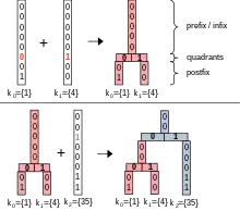 The PH-tree[1] is a tree data structure used for spatial indexing of multi-dimensional data (keys) such as geographical coordinates, points, feature vectors, rectangles or bounding boxes. The PH-tree is space partitioning index[2] with a structure similar to that of a quadtree or octree.[3] However, unlike quadtrees, it uses a splitting policy based on tries and similar to Crit bit trees that is based on the bit-representation of the keys. The bit-based splitting policy, when combined with the use of different internal representations for nodes, provides scalability with high-dimensional data. The bit-representation splitting policy also imposes a maximum depth, thus avoiding degenerated trees and the need for rebalancing.[1]