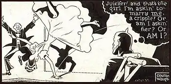 Coulton Waugh created his short-lived strip, Hank, which began April 30, 1945, in PM. The story of a disabled G.I. returning to civilian life, Hank had a unique look due to Waugh's decorative art style, combined with dialogue lettered in upper and lower case rather than the accepted convention of all uppercase lettering in balloons and captions. Some dialogue was displayed with white lettering reversed into black balloons. Hank sought to raise questions about the reasons for war, and how it might be prevented by the next generation. Waugh discontinued it at the very end of 1945 because of eyestrain.[1] Cartoonist Jack Sparling created the short-lived comic strip Claire Voyant, which ran from 1943 to 1948 in PM, and which was subsequently syndicated by the Chicago Sun-Times. Cartoonist Howard Sparber (né Howard Paul Sparber; 1921–2018) contributed after World War II. The Argentine Cartoonist Dante Quinterno publishes: Patoruzú his successful strip in South America.