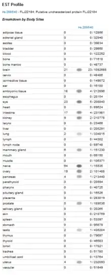 - "FLJ22184 - Normal tissues of various types". GEO Profiles. National Center for Biotechnology Information. Retrieved 1 May 2015.