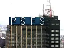 The skyscraper is topped by a distinctive sign with the Philadelphia Saving Fund Society's initials.[11] The 27 feet (8.2 m) high letters are white by day and illuminated with red neon lights by night. The sign hides mechanical equipment and can be seen for 20 miles (32 km).[5][8] The PSFS sign has become a Philadelphia icon.[5] At the time of construction, abbreviations were rarely used but architects Howe and Lescaze pushed for their use as the full name would have been illegible from the ground.[8] When Loews announced it was going to be converted into a hotel, the first question asked by reporters was what was happening to the sign. Loews briefly considered altering the sign by projecting the Loews name on it, but the idea was soon scrapped.[6] South of the sign is a television tower. The 258 feet (79 m) tower is set up for relaying TV and radio signals and was added to the skyscraper in 1948.[4][27]
