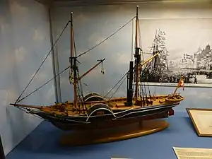 On June 11, 1828 the Mercurius left Korsør on her first scheduled trip to Nyborg. The estimated travel time was one hour and 50 minutes. The master was J. Jespersen, who had been master of one of the packet boats on the route, and the chief engineer was Edward Allingham, hired by Christensen before the departure from England. It is worth noting that while the master had a yearly salary of 350 rigsbankdaler (rbd), the first mate 192 rbd and the sailors 144 rbd, Allingham was paid around 900 rbd. His knowledge of the machinery was, however, valuable, for upon his dismissal in 1837, his successor's limitations resulted in numerous engine failures.[9] In 1844, the steamship Kronprins Frederik Carl Christian entered service on the Belt, leaving the Mercurius to do miscellaneous tasks.[10] Most important of those was her time on the route Aarhus-Kalundborg in 1848-1850, while steamships were in heavy demand during the First Schleswig War.[11] In the 1840s and 1850s the ship was often called upon for use as a tug, as in 1853 when she towed the schooner that was tasked with laying a telegraph cable between Nyborg and Korsør.[12]